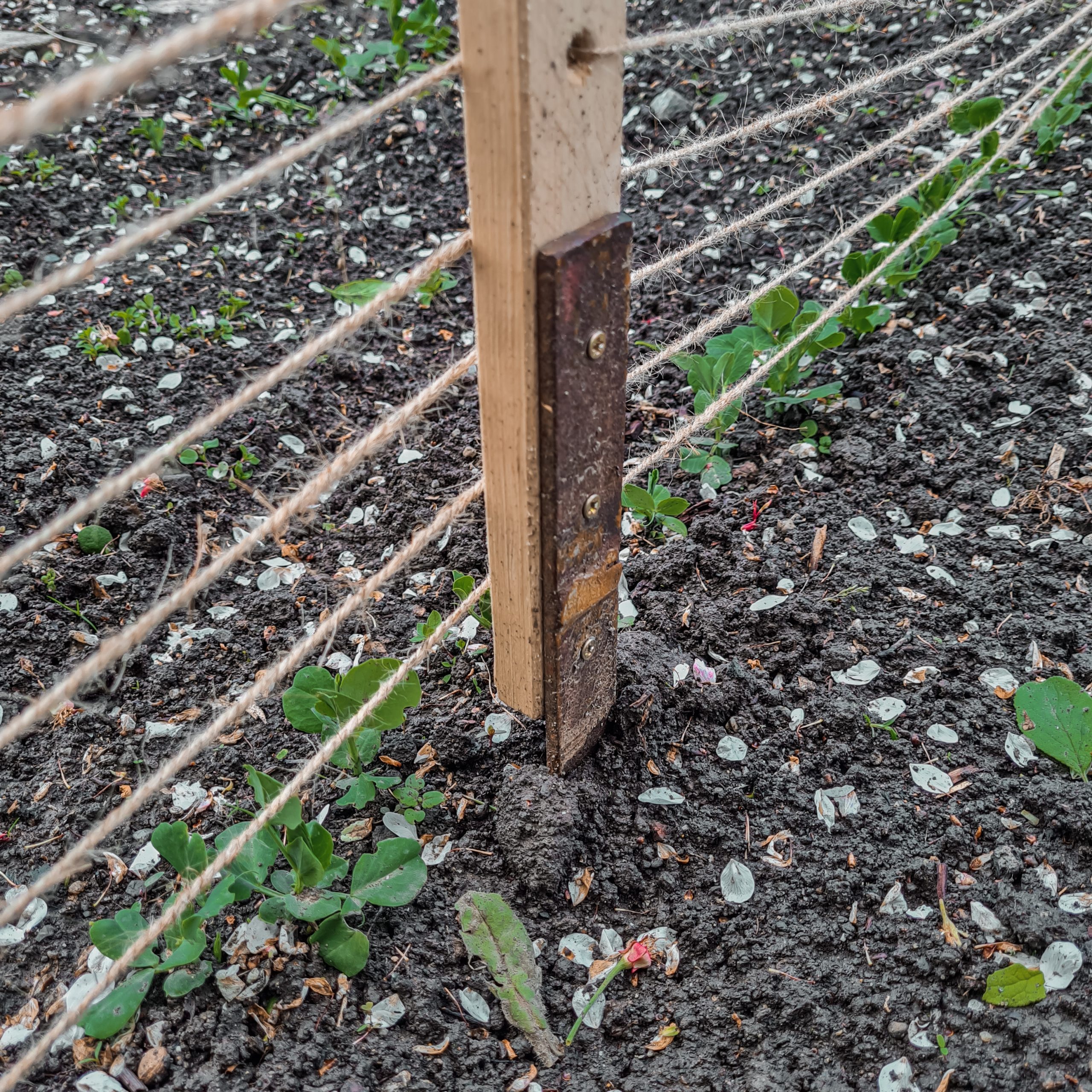 Für den eigentlichen Halt der Pflanzen benutze ich ganz einfache Gartenschnur. Die Länge meines Beetes beträgt zirka drei Meter und damit auf dieser Länge die Schnur nicht durchhängt, verwende ich insgesamt drei Leisten als Halterung.